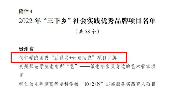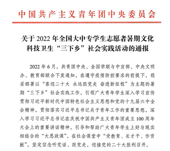近日,团中央下发了《关于2022年全国大中专学生志愿者暑期文化科技卫生“三下乡”社会实践活动的通报》,表彰在2022年“三下乡”社会实践活动中表现突出的优秀集体、个人和项目。世界杯官网团委荣获“优秀单位”称号,团委“互联网+云端助农”项目品牌荣获“优秀品牌项目”。
