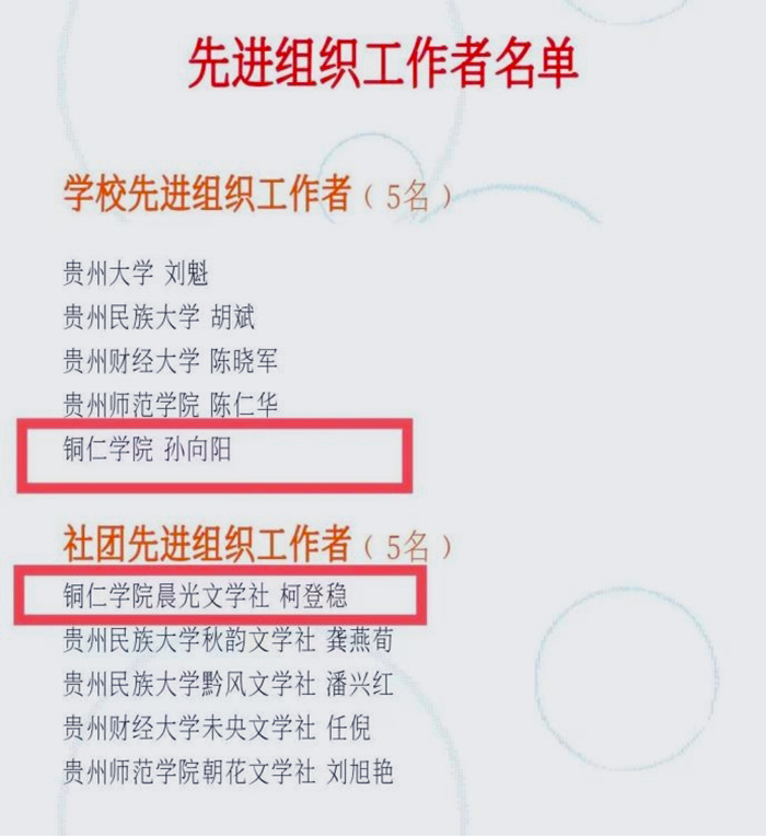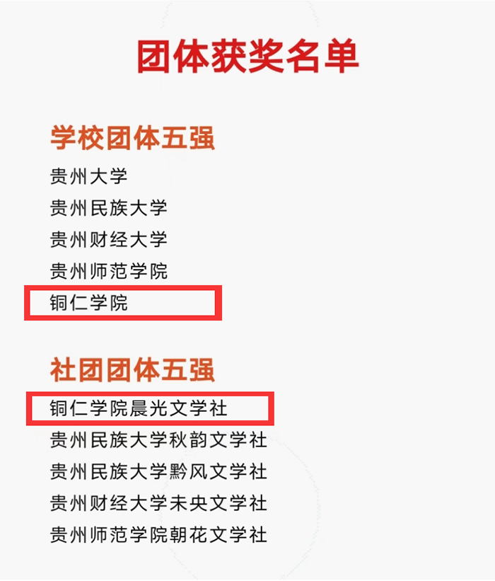 10月31日,由《当代教育》编辑部主办的第六届贵州省大学生文学大赛获奖名单揭晓。世界杯官网晨光文学社社员李甜甜、楚槐序荣获二等奖,杨玉林、杨旭、周开芳获三等奖,陈颖华、杨昕晨、熊琦、潘柔玉、黎焱玲、安琪、柯登稳、何小蝶、陈江荣获佳作奖;世界杯官网、晨光文学社、晨光文学社指导老师孙向阳、社员柯登稳分别荣获“学校团体五强”“社团团体五强”“学校先进组织工作者”“社团先进组织工作者”称号。