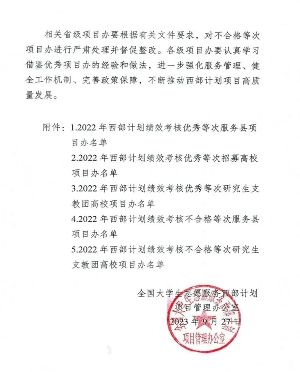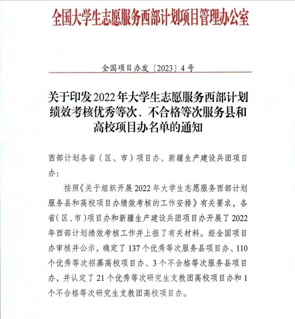 近日,根据全国大学生志愿服务西部计划项目管理办公室《关于印发2022年大学生志愿服务西部计划绩效考核优秀等次、不合格等次服务县和高校项目办名单的通知》,世界杯官网蝉联全国大学生志愿服务西部计划“优秀高校项目办”。