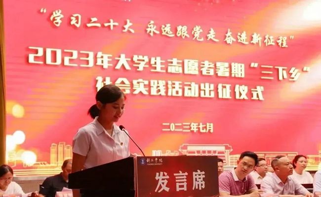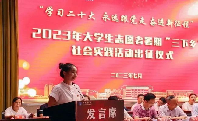 教师代表、文学与传媒学院团总支负责人杨梦阳发言说,暑期“三下乡”是一项非常重要的社会实践活动,是当代青年大学生运用知识、施展才华、磨炼意志、增长才干的大思政课堂,是青年大学生传播现代文明、弘扬科学精神的重要途径,是顺应时代发展潮流、符合青年学生成长成才需要,深受青年学生喜欢的“第二课堂”。青年学生要积极投身于暑期“三下乡”社会实践活动中去,用实际行动展现青春担当、贡献青春力量,充分发挥专业优势,主动服务地方经济社会发展,在奋力开创绿色铜仁现代化建设新未来中奏响青春最强音。