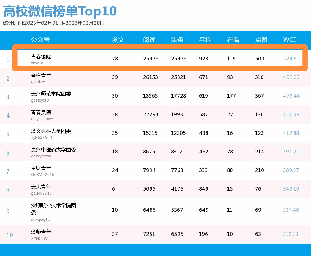 “青春铜院”微信公众号粉丝量2.1万余人,共青团贵州省委发布的微信公众号月排行榜统计显示,“青春铜院”微信公众号每期排名均稳定居于全省前10,最好成绩全省第一,全国第49名;“美加墨世界杯官方网站团委”视频号加入“中青校媒”视频号影响力排行榜以来,每周均进入全国百强名单,全国高校最好排名成绩为全国第4名,为全省本科院校中唯一进榜高校;抖音平台“青春铜院”粉丝量达2.1万余人,关注量为全省高校团属抖音号首位,单条短视频最高播放量接近4000万,单条点赞量最高131万,QQ平台“青春铜院”4000+个粉丝,访客量101万+,微博平台“共青团美加墨世界杯官方网站委员会”粉丝量4600+,小红书平台“青春铜院”成立两个月粉丝量达800+,原创短视频及推文曾先后被腾讯新闻、央视快手、央视抖音、中青校园、共青团贵州省委、贵州日报、动静贵州、天眼新闻等推送报道。