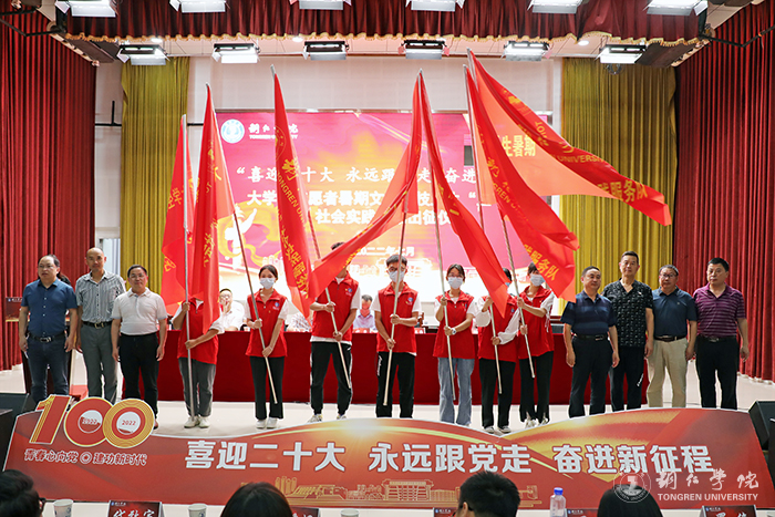 仪式上,出席仪式的领导分别为1支国家级理论宣讲团队代表、14支省级专项实践队伍代表、7支校级专项实践队伍代表进行授旗。