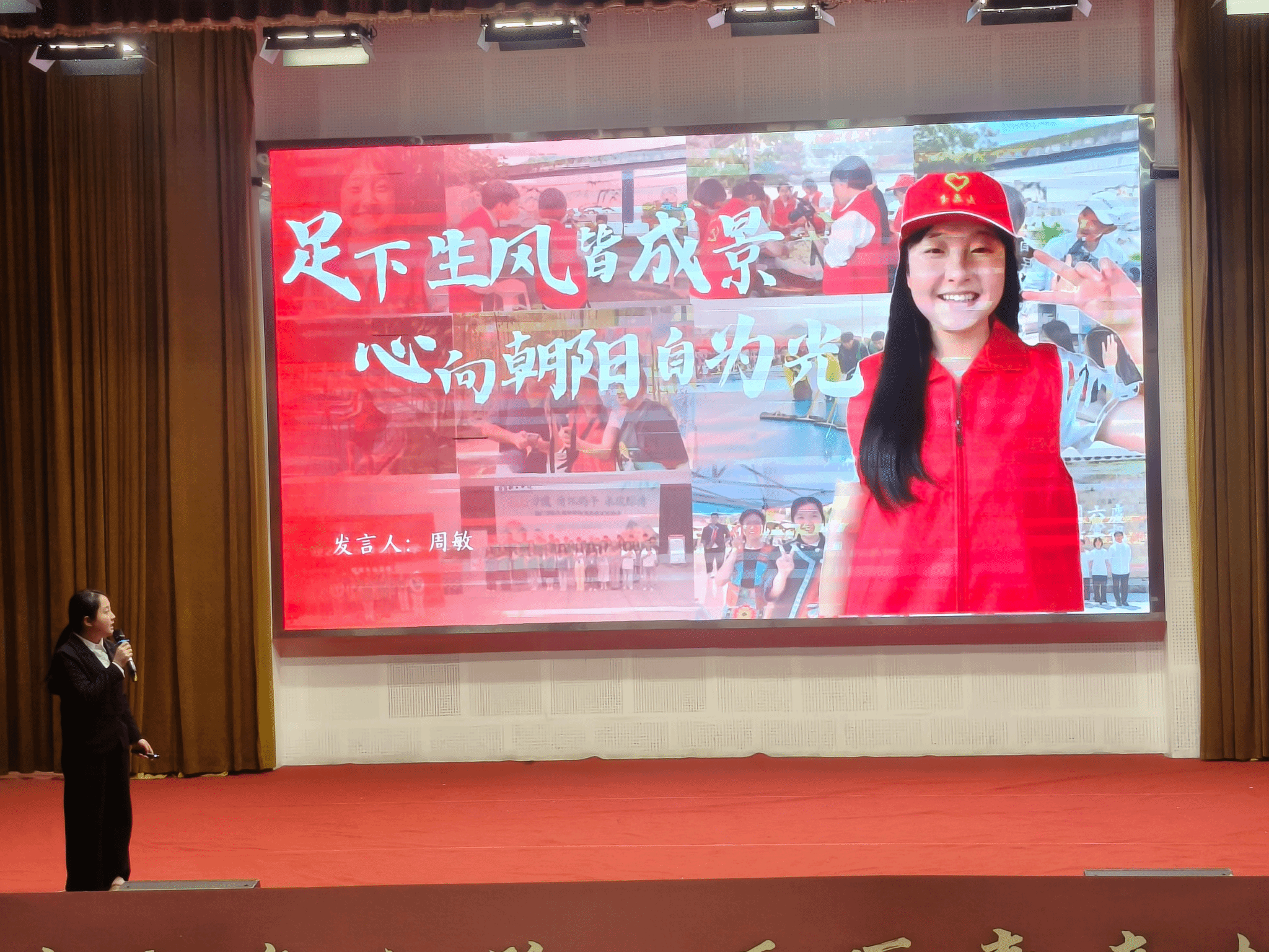 成果展示环节分为五个篇章,全面呈现了学校第二课堂实践育人成果。在“红色青春·理想铸魂”篇章,微团课《一封家书》通过情景再现方式,展现了青年学子的思想升华与使命担当;“紫色青春·创新创业”篇章中,挑战杯国赛三等奖获奖项目《铝程新源——户外电源的铝电革命》团队代表朱红颖同学分享了将爱国热情转化为科技报国的实际行动;“绿色青春·志愿同行”篇章邀请优秀志愿者周敏同学讲述了支教、助老等服务中的感人故事;“蓝色青春·社会实践”篇章展示了《互联网+云端助农》品牌项目,体现学子将专业知识转化为服务社会的实践能力;“橙色青春·美育浸润”篇章中,大学生艺术团的啦啦操表演以艺术形式传承“一二·九”运动精神。