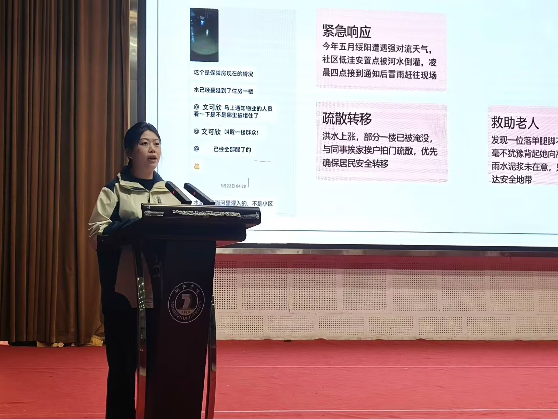 随后三位志愿者依次登台,分享基层服务经历。志愿者杨安乐分享了自己从初到基层的紧张不安,到与社区老少融洽相处的转变,她策划组建的“糖果书社”从最初仅5名小朋友参与,逐步发展到能独立举办文艺晚会,朴实话语中满含投身西部服务的热忱。志愿者文可欣讲述了自身从大学时期混学分到深入基层快速成长的蜕变,她日常帮扶困难群众,不仅背老奶奶出行、开导有辍学念头的小女孩,还长期照料腿脚不便的邓婆婆,更分享了在绥阳遭遇强对流天气时,与同伴4小时紧急疏散12栋居民的经历,讲到动情处几度哽咽,坦言深刻体会到群众信任的重量,深知唯有心系群众才能传递真情。志愿者陈杰则以幽默风趣的风格,讲述了宣讲医保政策、整治社区环境、照料空巢老人等日常工作,他还打造专属贵州的抖音账号,用镜头记录当地风貌,直言“对贵州爱的深沉”,鲜活表达引发现场阵阵掌声。