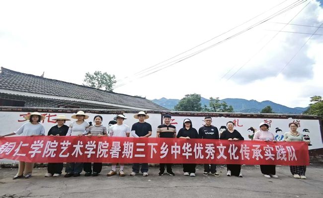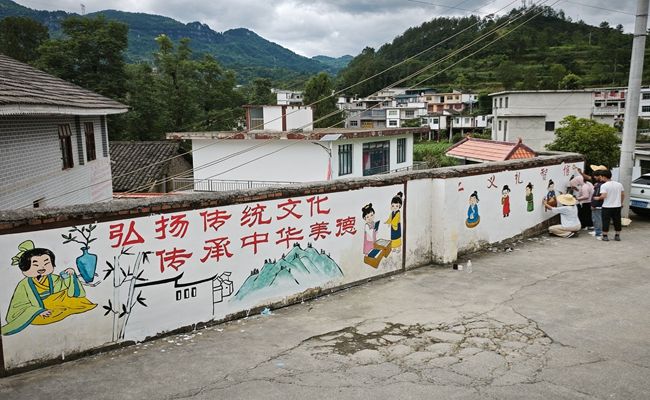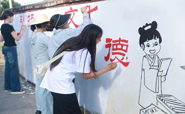 2025年7月2日至3日,美加墨世界杯官方网站艺术学院暑期“三下乡”中华优秀文化传承实践队由两名教师与八名学生组成的队伍走进德江县潮砥镇营盘村,进行为期两天的社会实践活动,队伍主要通过墙绘形式传递优秀传统文化内容。以墙画为笔、以文化为墨,在乡村的白墙上勾勒出一幅幅绚丽多彩的画卷,让中华优秀传统文化在乡村振兴的征程中焕发新的生机。