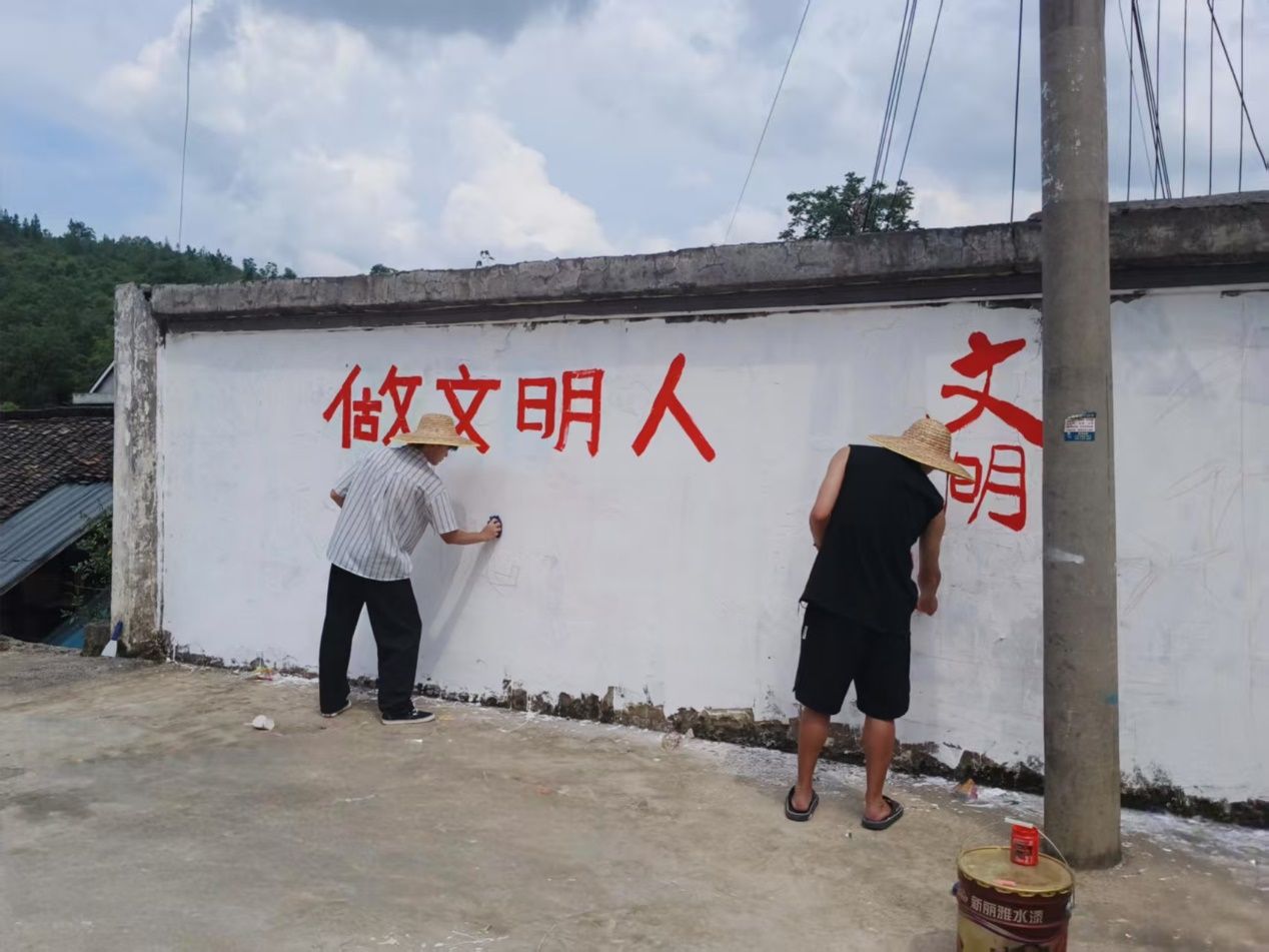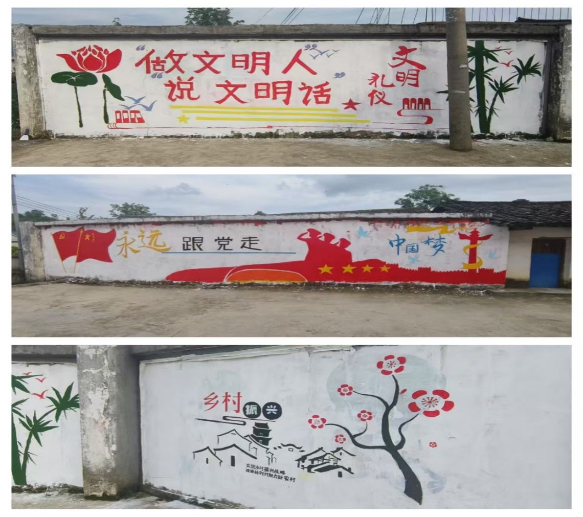 活动当日,实践队立足专业特色,聚焦老屋村村委会墙面,围绕“乡村振兴”“文明礼仪”“中国梦”等内容,传承文化使命,助力乡村振兴,为美丽乡村建设注入文化力量。团队成员们分工明确,配合默契。有的构图勾线,有的专注涂色,充分发挥专业优势。七月高温下,师生们顶着烈日作业,汗水浸透衣衫仍专注绘制,将专业技法与乡村需求结合,用色彩线条呈现产业兴旺图景、文明生活场景及家国愿景,让墙面成为传递文明与振兴理念的文化阵地。