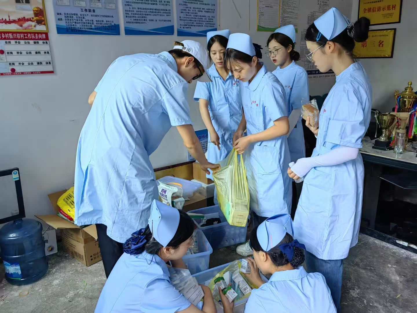 第三天上午,由大健康学院学生科郭易可老师、牛郎镇四茶园村张书记带队,护理系印双红、田芬、李寅翠、蔡春连等教师分三组深入木寨村中,带领护理系学生为村民开展免费血糖、血压检测服务,并结合健康宣教关于高血压和糖尿病的预防,将专业护理实践与乡村振兴需求深度融合。
