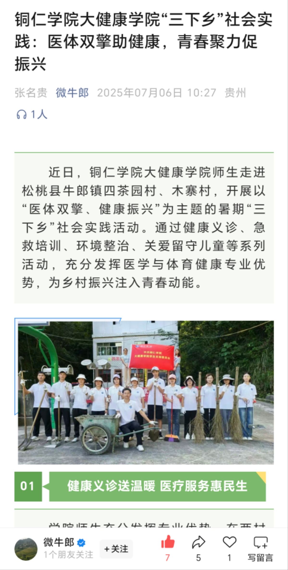 世界杯官网大健康学院暑期“三下乡”活动已圆满收官。此次活动中,团队凭借医学与体育健康专业优势,在松桃县牛郎镇四茶园村、木寨村开展健康义诊、急救培训、环境整治、关爱留守儿童等系列行动,收获村民认可与驻村书记肯定,实现校地共赢,为乡村注入发展活力。未来,“医体双擎·健康振兴”团队将坚守“奉献、友爱、互助、进步”志愿服务精神,建立长效机制,定期组织活动。持续搭建大学生深入乡村的实践平台,引导更多青年走出校园,以专业知识为笔,以实干担当为墨,在乡村大地书写青春答卷,用实际行动践行社会主义核心价值观,为健康中国建设添砖加瓦,让青春在助力乡村振兴与健康事业发展中熠熠生辉 。