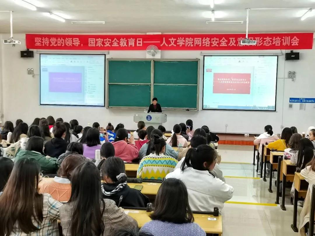 4月14日,我院于博思楼302召开“坚持党的全面领导,国家安全教育日——人文学院网络安全及意识形态”培训会,深入学习领会习近平总书记关于网络强国的重要思想。此次培训会由我院党委副书记杨兴英主讲,学生科全体老师出席培训会,人文学院团总支学生干部联合会全体成员及该院部分同学共二百余人参加培训。