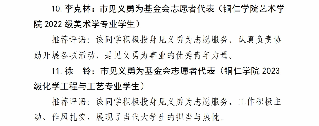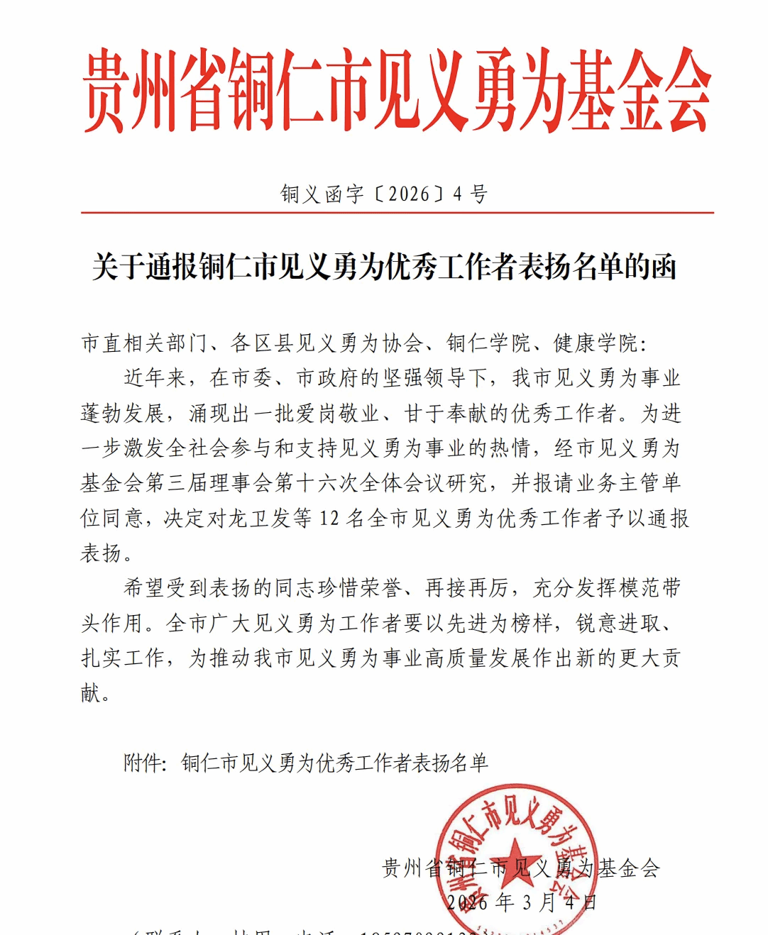 近日,学校收到了贵州省铜仁市见义勇为基金会发来的《关于通报铜仁市见义勇为优秀工作者表扬名单的函》,对其中包含世界杯官网艺术学院2022级美术学专业学生李克林、材料与化学工程学院2023级化学工程与工艺专业学生徐铃在内的12名全市见义勇为优秀工作者予以通报表扬。