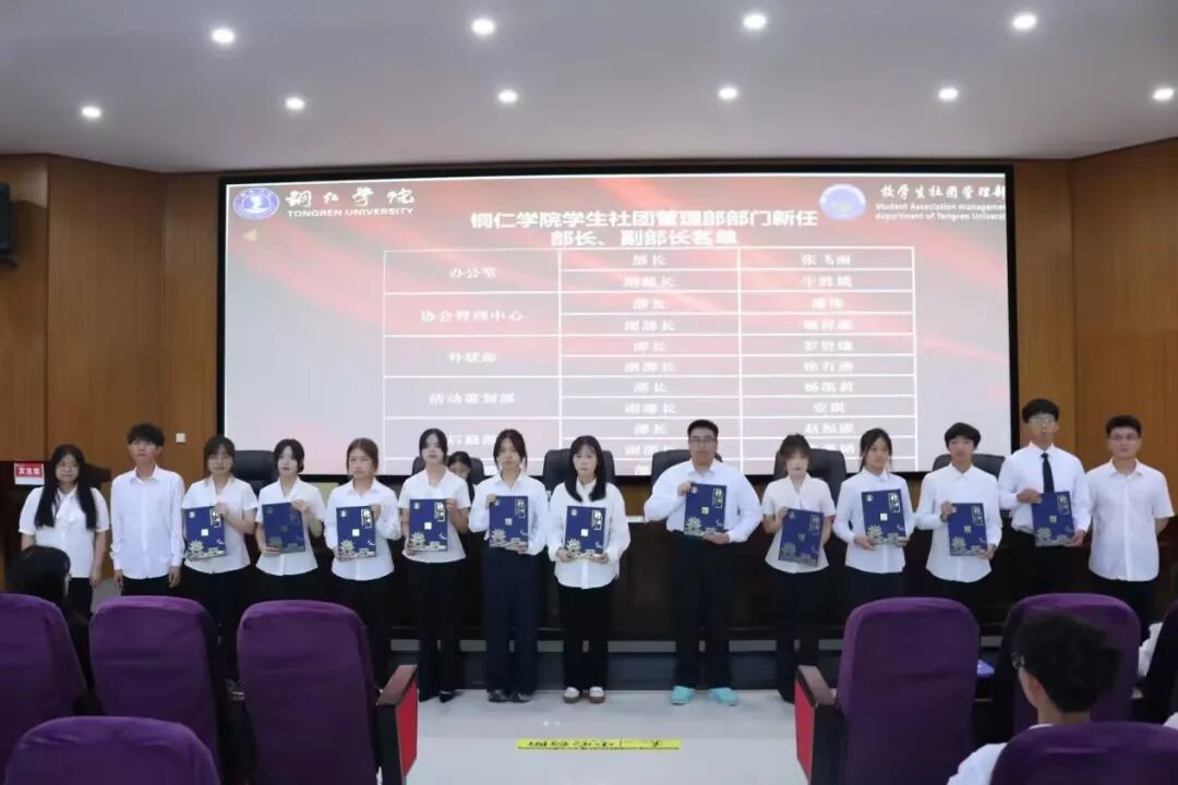 随后,在一阵掌声中,主持人宣读了新任主席团、部长团和会长团名单。指导老师徐秋逸、上一届主席团成员王庭东、杨浩、李宏玉为新任主席团、部长团和协会会长团颁发聘书。