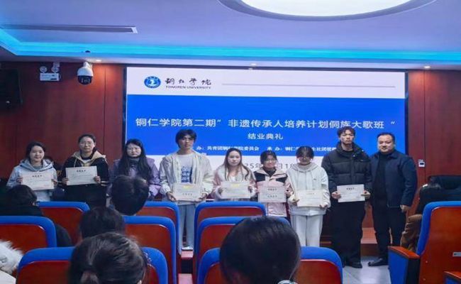 近日,为丰富校园文化内涵,推动中华优秀传统文化在高校的传承与创新,以非物质文化遗产为载体,铸牢中华民族共同体意识,美加墨世界杯官方网站第二期“非遗传承人培养计划之侗族大歌班”结业典礼在学科大楼717报告厅圆满举行。此次活动由共青团美加墨世界杯官方网站委员会主办,学生社团管理部承办,标志着该校在非遗教育与民族团结融合实践中迈出扎实一步。研究生院副院长龙兴林、哲学与历史学院高志勇博士、苗歌非遗传承人吴珍碧、龙凌云、古琴演奏家王丹、校团委社团管理部负责人徐秋逸老师、校团委学生兼职副书记刘小玲、25级马克思主义理论专业研究生刘玲燕,培训班学员100余人参加结业典礼,活动由优秀学员孔爽主持。