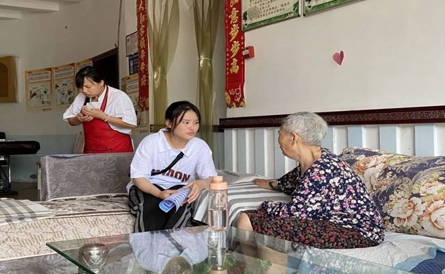 七月的夏天,暴雨过后湿润的空气中夹杂着啾啾蝉鸣,伴随着这夏日悠悠的乐章,我们走进了逸馨园养老院。团队的小伙伴们怀揣着激动的心情带着礼物站在门口,正当我们还在思考如何与爷爷奶奶们融洽交流的时候,一位奶奶用苍老的方音打破了我们的窘迫。她对我们热情地说到:“快来我这儿坐!”后来我们了解到这位夏奶奶已经八十五岁高龄了,许多事情她都已经记得不太清楚,有时自己刚刚才说的话也会忘记,要反反复复地说好几遍。可是就是这样一位八旬老人,她却清清楚楚地记得她年轻时学习过的红歌,“革命军人个个要牢记,三大纪律八项注意……”说着奶奶悠扬的歌声就唱了起来,脸上是抑制不住的骄傲与自豪,她边唱边与我们讲述革命的故事,嘴里止不住的赞扬党和国家。她说:“我虽然没有什么文化,但是我知道要忠于国家忠于党。”夏奶奶虽年老体迈,但她的灵魂仍在这个新世纪迸发出耀眼的光芒,感染且滋润着我们。