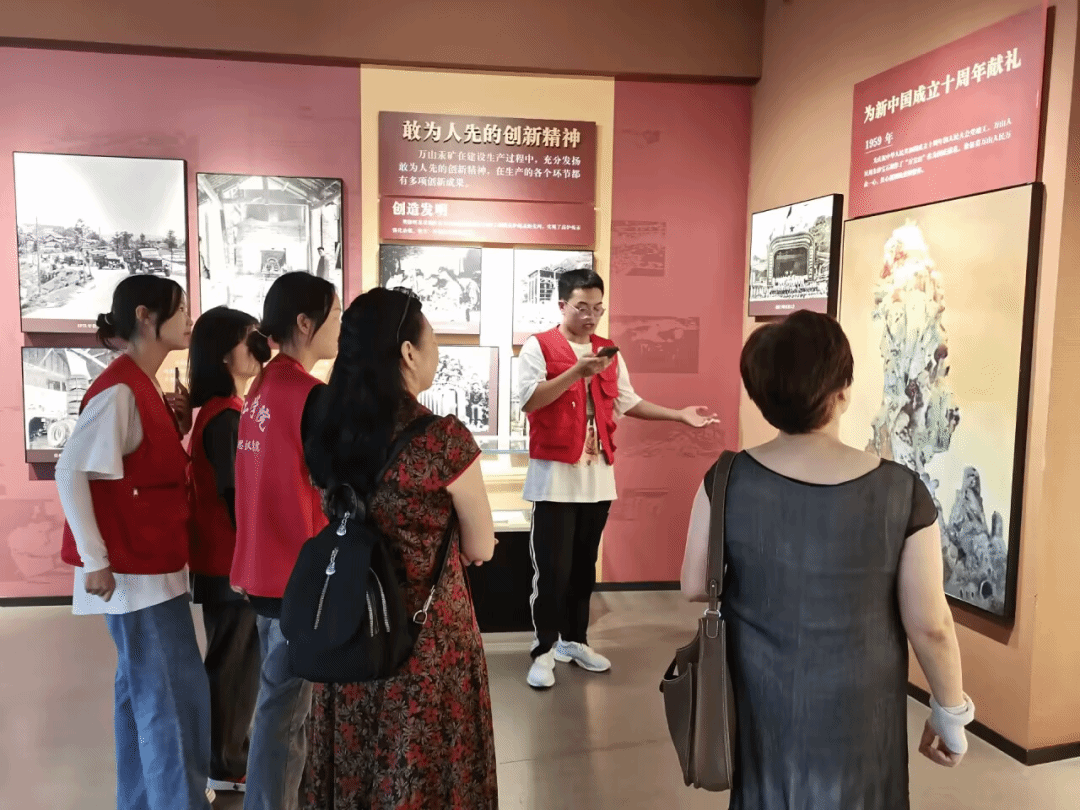 走进万山新时代爱国主义教育基地,团队成员深刻感受到浓厚的爱国主义情怀,备受感染和鼓舞。经过与基地讲解员的交流后,队员们各司其职,切实将此次服务活动准备工作做实做细。随后,队员们在讲解员的陪同下参观了万山爱国主义教育基地,了解到万山汞矿开发、枯竭、转型的历史,以及近年来万山爱国主义教育基地的基本情况和接待游客类型,为本团后期更好地服务爱国主义教育基地打下夯实的基础。