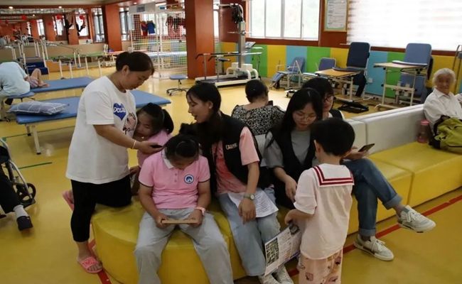 “小伙子,你刚刚讲的这个是什么啊?”“奶奶,这是防范电信诈骗的方法,不法分子就经常对老年人下手,奶奶您可要多注意啊。”一位男队员回答到。同时,部分实践队员深入儿童康复治疗区,和小朋友玩游戏、做康复训练、给他们讲故事、教他们唱歌、和他们一起拍照...