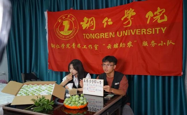 “贵州特产沿河沙子空心李,果肉脆嫩,清香浓甜,具有清热解毒,健脾开胃之功效,心动的朋友们赶紧下单吧!”直播间里,来自校团委青媒工作室的周冬菊、舒大川同学正热情洋溢地为观众们介绍沿河空心李,主播、助播、运营、摄像等岗位的队员们各司其职,整个直播过程有条不紊。