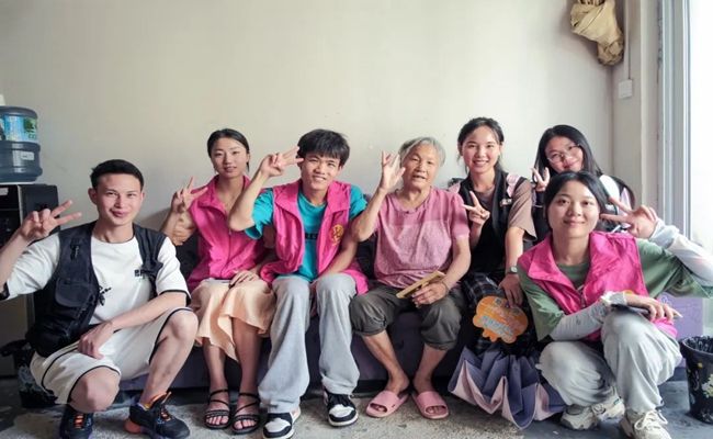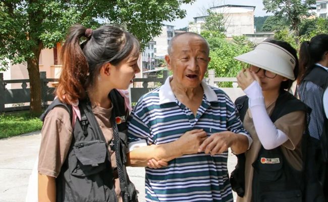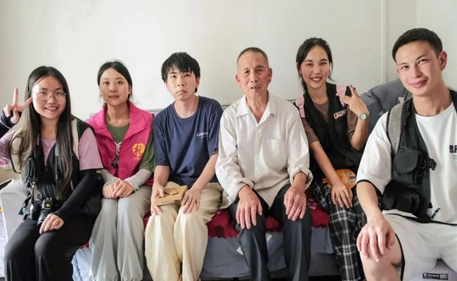 随后,实践队来到老兵万水昌、何再福、陈翠云等老人的家中进行探访慰问。退伍老兵万水昌年事已高、视力较弱,但只要谈及当年的故事,老人立即神采飞扬:“以前过的是苦日子,我很怀念当兵时候的战友们。现在政府政策越来越好了,我们退休以后给了各种补贴和费用。”陈翠云老人腿部萎缩、行动不便,但她性格开朗,积极面对生活中的困难,得知“向日葵”小队是下乡开展公益摄影活动的,她高兴地叫上孙子孙女与自己合照。