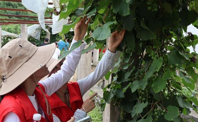 7月5日,在星光村村长和村支书的热情引领下,团队一行人来到了村内的继梅农庄葡萄观光园,这里不仅是星光村的特色产业之一,也是当地乡村旅游的重要组成部分。继梅农庄葡萄观光园构建了集葡萄种植与鸡鸭鱼养殖于一体的循环生态系统。村长和村支书向团队成员详细讲述了星光村近年来的发展历程,从基础设施的全面提升,到特色产业的精准培育,再到村民生活的显著改善,每一步都凝聚着乡村振兴政策的智慧与力量。