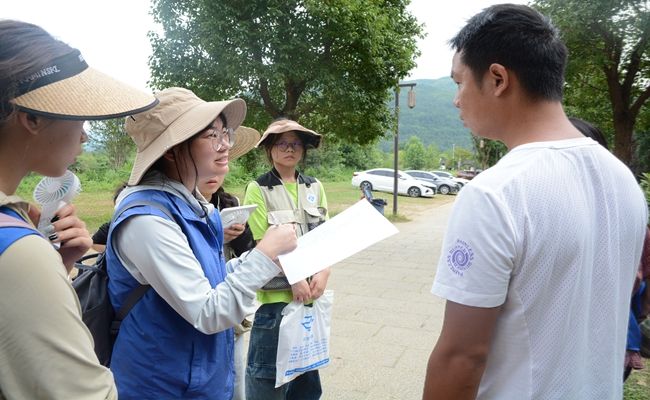 7月9日,为更好地开展调研工作,环境治理小队联系了梵净山村支部副书记张书记,洽谈调研所需配合的相关事项,并详细了解了梵净山村环保意识宣传方面的措施和政策,以及村民对垃圾分类宣传的态度。通过与张书记的交谈,环境治理小队对梵净山村的环境治理情况有了大致的了解。在前往寨沙侗寨的途中,队伍使用“两步路户外助手”对沿途的垃圾桶分布、路面环境、以及锦江上游河流水质进行了详细的拍摄和记录。到达寨沙侗寨后,环境治理小队分成三个小组,分别对游客、个体工商户和原住居民进行问卷调查,了解他们对当地环保宣传、四类基础垃圾的处理方式以及对梵净山村环境治理的建议。