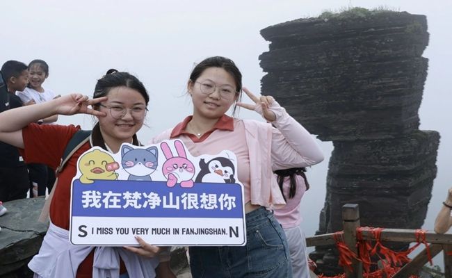 “梵净山山高险峻,有着‘一山四季’的气候特点、独特的丹霞地貌和壮观的云海景观,其海拔高达2572米。攀登这座山峰,不仅是对自我的一次挑战,更能让我们感受到贵州大自然的多彩风光。如果你也有兴趣,不妨来看看吧!”直播间中,来自“铜仁文旅推荐官”实践队的周冬菊和杨梦婷同学正在细致讲解梵净山景区的相关信息和独特魅力。