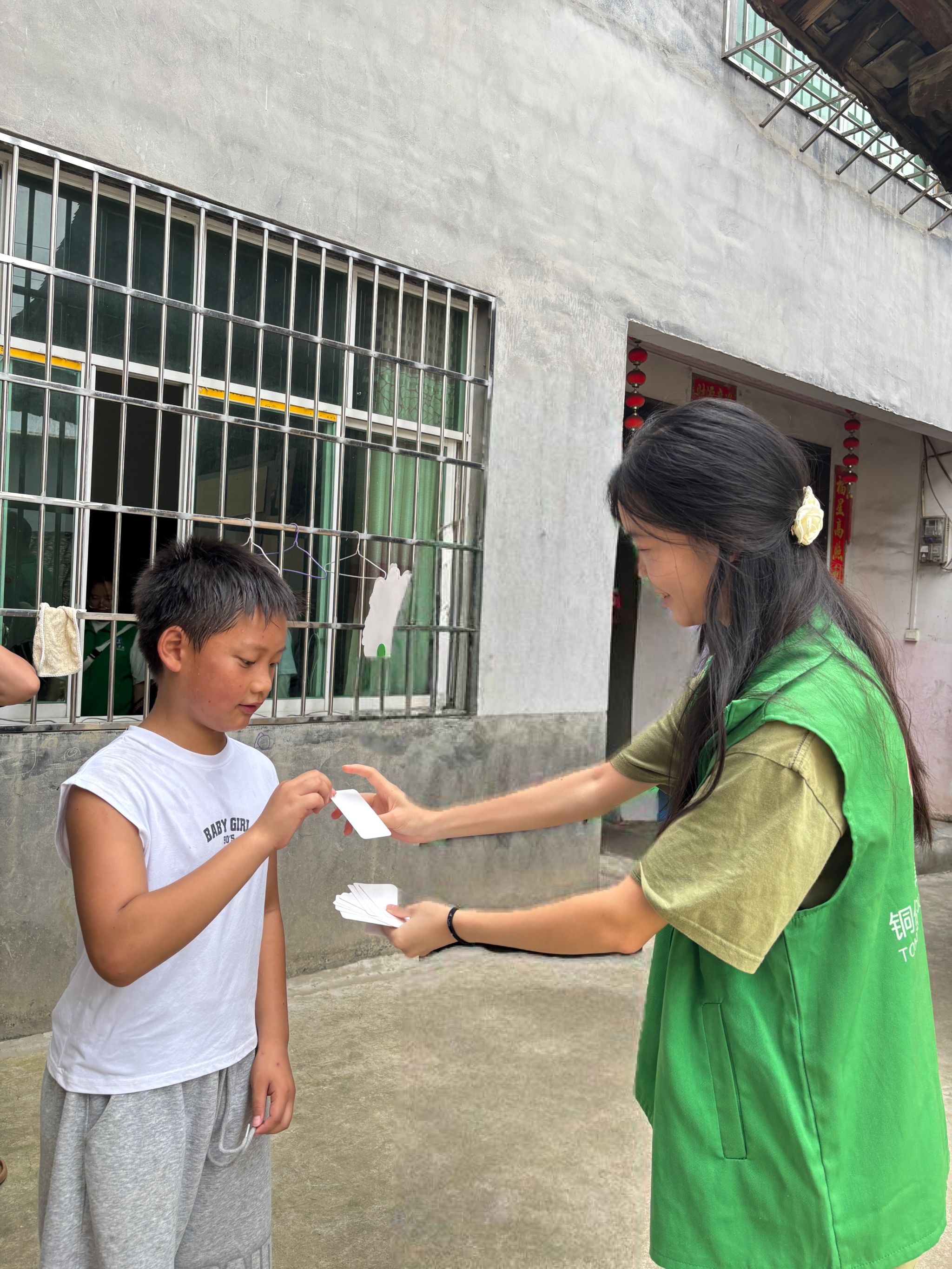 7月9日,实践团精心设计“诵读卡片”和“方言猜词”两项特色活动。在“诵读卡片”环节中,队员们悉心准备了蕴含着古诗词与经典语句的卡片,引导孩子们逐一朗读,以此培养他们的语感和朗读技巧;“方言猜词”环节巧妙地将当地特色方言与普通话相结合,通过生动有趣的双向交流,既让孩子们增进了对家乡文化的了解,又锻炼了他们的语言转换能力。活动接近尾声时,队员们与孩子们共同合唱《让我们荡起双桨》、《虫儿飞》等普通话儿歌,让孩子们在欢快的氛围中更好地掌握语音语调,为此次实践活动画上了一个圆满的句号。