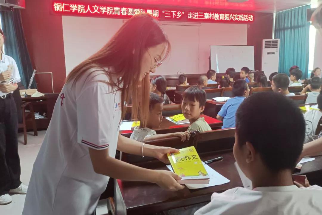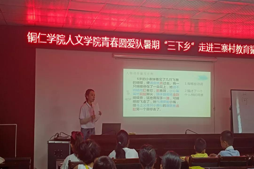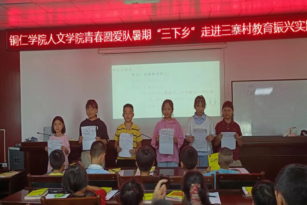 7月24日,人文学院青春圆爱队前往碧江区正光街道三寨村开展暑期“三下乡”社会实践活动之写作课堂教学。此次活动由人文学院团总支书记赵娟带队,10名志愿者同行。碧江区正光街道60余位学生参加此次暑期实践活动,由志愿者何思雨主讲此次教学活动。 在教学活动开始前,志愿者给参加此次写作课堂的60余名小朋友发放了写作书。发放完毕后,何思雨向小朋友们自我介绍,同时利用课堂小游戏与小朋友们互动,拉近和小朋友们之间的距离,调动小朋友们的积极性并为后续课堂教学打下基础。 (志愿者发放写作书) 课上,何思雨给小朋友们讲解了写作时运用的描写和一些注意事项,她说,写作是让我们对日常的事进行描述,并进行思考,把思考结果变成文字留存。讲解完毕后,她针对写作的技巧与方法对小朋友们进行一一解答。 (主讲人何思雨) 她在上课时,利用一些小短文例子让小朋友更加深刻的了解写作的方法与技巧,并随机邀请小朋友朗读小短文。同时,让小朋友在小短文中找到运用了哪些描写手法。最后,何思雨采取课堂现场写作的方式结束了此次课堂,小朋友们都非常认真地对待这次写作。写作完成后,何思雨随机抽选小朋友上台把自己的作文朗读给大家听,小朋友们积极举手上台,现场气氛十分融洽。 (互动现场) 何思雨表示,文章的力量是不可估量的,写作可以带来感动。同时,写作对于我们还有更重要的意义,想要展示自我时,最有说服力的手段莫过于写作。写得一手好文章,可提升自己的说服能力,提高语言的表达能力,进而能提高与人交际的能力,对学习其他学科也都大有裨益。 (小朋友朗读自己的作文) (作文展示) 此次活动为学生提供了展示自我的平台,极大地促进了学生学习写作的积极性,培养了小朋友的即兴写作兴趣及写作能力。小朋友们纷纷表示,此次写作课的开展让自己也收获了许多写作技巧,并十分期待后续的活动。 来 源丨美加墨世界杯官方网站人文学院 编 辑丨吴凯霞(美加墨世界杯官方网站青媒工作室) 一 审 |赵娟老师(人文学院) 终 审丨田自立(美加墨世界杯官方网站团委)