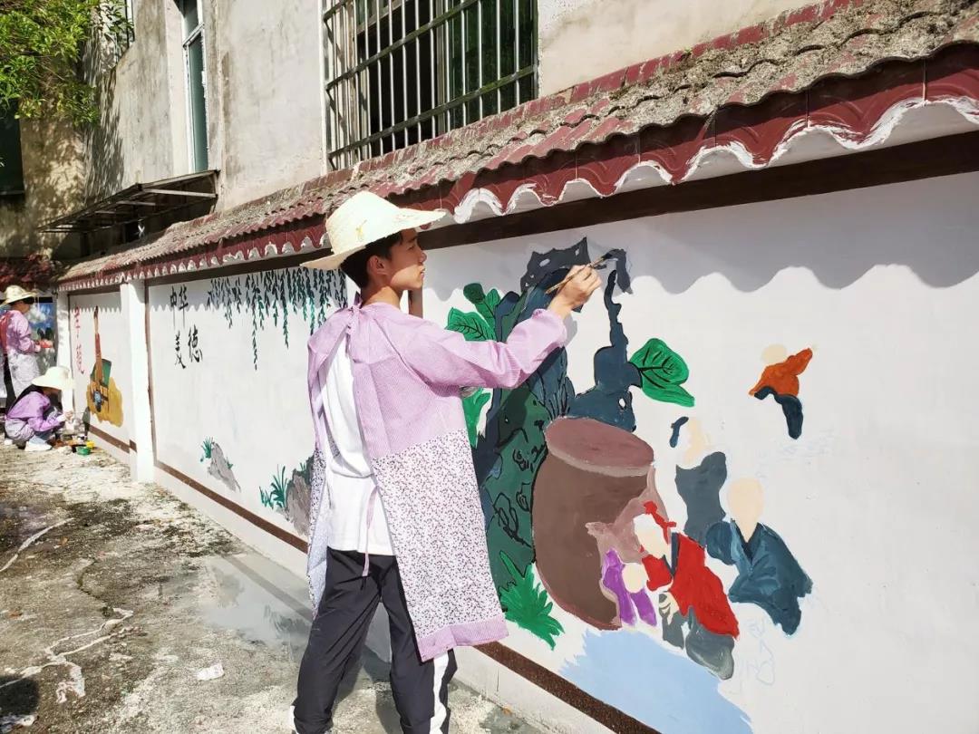 在墙画绘制现场,实践队员们明确分工、团结协作,围绕礼、义、廉、洁以及美丽乡村、成语故事等主题,先后完成了数十幅构思巧妙、生动形象的墙绘作品,为村容村貌注入新活力。由于墙绘采用的是丙烯颜料,清洗难度较大,实践队员们衣服上、头发上粘上颜料无可避免,加上天气时而下雨时而烈日,但是他们没有退缩,用自身过硬的专业能力完成了绘制任务,为美丽乡村建设贡献一份力量。