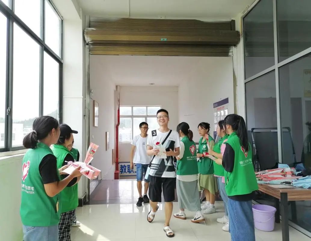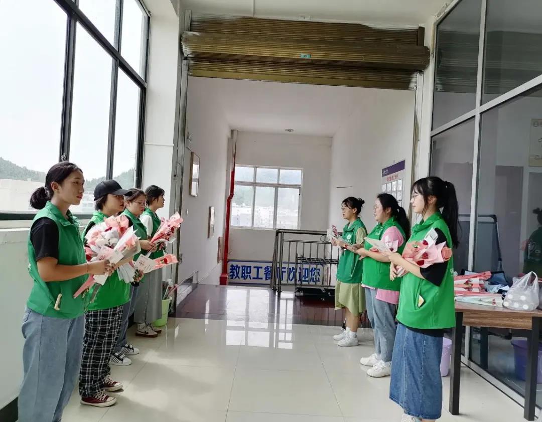 9月10日,为了迎接第37个教师节的到来,弘扬尊师重教的优良传统与社会风尚,提高对教师为教育事业所做贡献的认识与评价,增强教师对投身教育事业的荣誉感,世界杯官网青年志愿者服务大队于行政楼、紫薇教职工餐厅开展了“浓浓尊师意,款款爱生情”教师节服务活动。 (志愿者们做活动准备工作) 活动中,志愿者们分工合作,积极配合,同时也动员同学们参与进来,为了给教师们一份温馨的节日祝福,志愿者们提前来到活动现场,通过多种多样的方式来表达对老师的祝福、问候与敬爱之情。 在志愿者们亲手制作的一张张祝福贺卡、装饰精致的一束束花朵、带着一句句温暖的问候语走访办公室与教师食堂,老师们脸上洋溢着幸福的笑容,说出了许多心声。教师节志愿服务活动内涵丰富、意义深远,呈现出一幅幅温馨而美好的画面…… 老师们也祝愿同学们学习永无止境,知识源源不断,在今后的日子里学而不厌,为祖国贡献自己未来的师资力量! 徐徐秋风,绽放节日的花朵;学子真情,感念浓浓的师恩。通过此次活动的开展,老师以及志愿者们度过了一个简朴、热烈 却又充满浓浓情谊的教师节。 “饮其流者怀其源,学其成时念吾师”,让我们向可敬可爱的老师们致以无尽的感激之情,感谢老师的教诲、关怀和无私奉献。