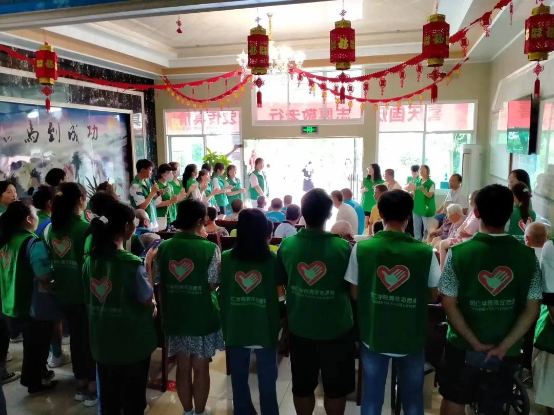 下午两点半左右,老人们的午休结束了。在同学们的带领下在客厅内有序坐好,观看来自志愿者准备的节目表演。