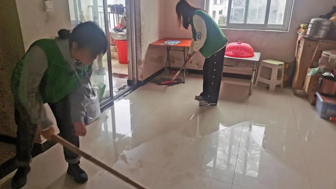 (志愿者认真打扫房间卫生)