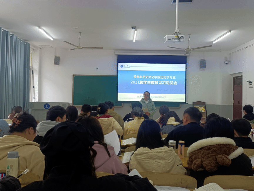 为帮助师范生更好地把握教育理论与实践之间的联系,提升师范生适应未来教育工作的能力,顺利开展本学期历史学2021级学生的教育见习工作,11月14日,我院于依仁楼A101教室召开了2021级历史学教育见习动员会。参与此次动员会的有历史系主任杨峻岭、历史学专业负责人杨春君及2021级历史学班全体学生。动员会上,杨峻岭就教育见习相关事宜及注意事项作了强调:第一,见习目的在于要了解中学教育教学的全过程并获得初步的教学体验,深刻理解立德树人的理念,形成正确的教师观;第二,要秉持谦虚好学的态度向指导老师学习,按照学习的要求完成见习任务,见习结束后及时总结并提交所有的材料;第三,见习期间要严格遵守见习纪律,按照见习学校的作息要求,积极参加各种教学活动和公益劳动,讲卫生、将仪表,做学生的表率。同时,杨峻岭还重点强调了见习期间的安全问题,见习工作以小组的形式完成,未经批准不得擅自离开团队从事与见习活动无关的活动。在前往见习学校的过程中,要注意出行安全,乘坐有营运资格的公交车、出租车,严禁乘坐无任何资质和手续黑车、黑的等。要妥善保管个人携带的随身财物,做好防盗、防诈骗的工作。在见习学校,自觉遵守学校的规章制度,不得与教师、学生发生冲突,做到宽容与谦让。如遇意外情况,及时向指导老师和学校汇报。此次教育见习动员会的开展取得了预期效果,不仅使学生对教育见习充满信心与热情,为接下来的工作开展做了充分准备。