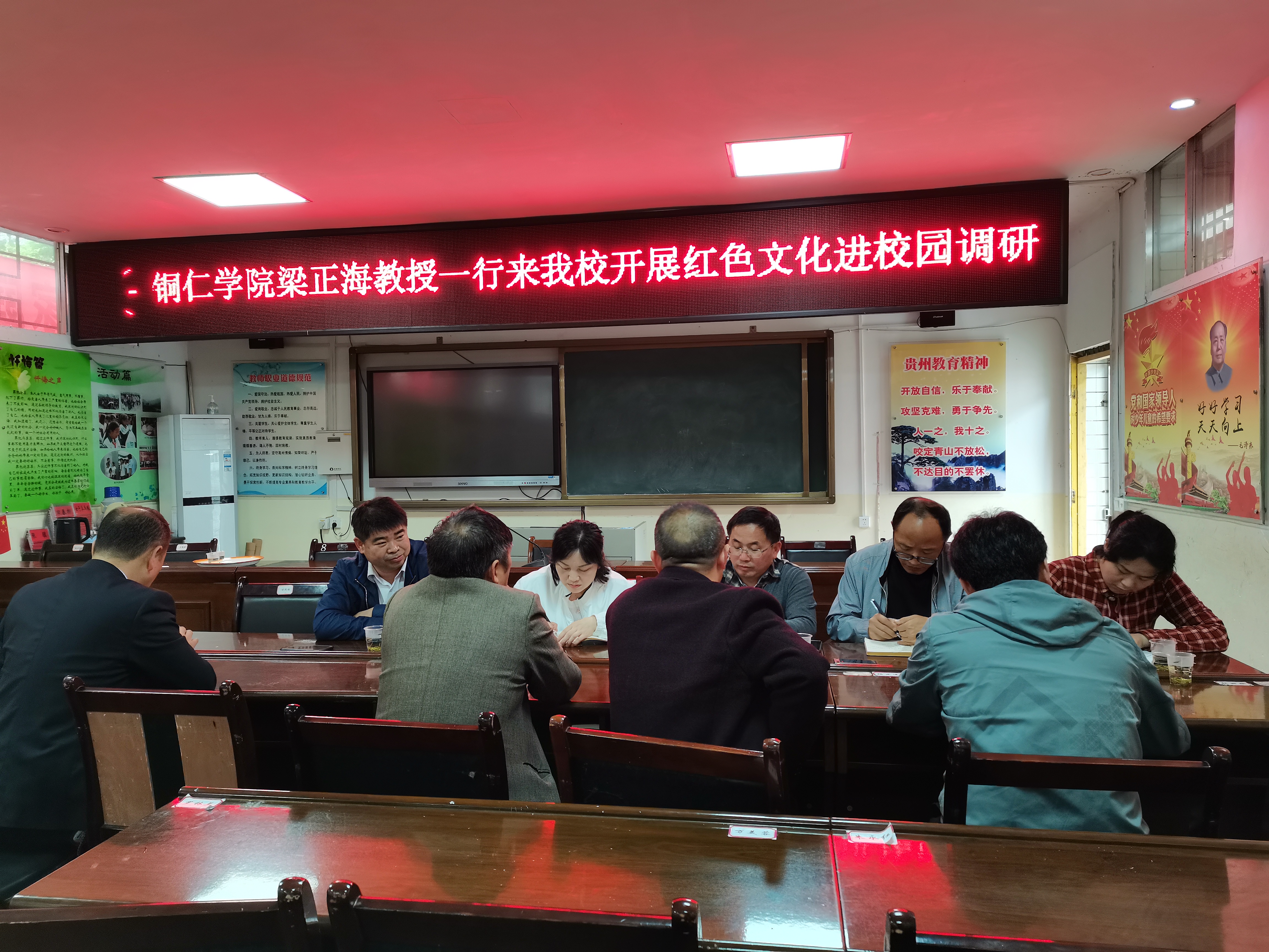 27日上午,调研组一行抵达印江自治县木黄镇并在木黄民族小学召开座谈会。该校校长田儒勇介绍了木黄民族小学的发展历程及红色基因赓续传承做法与成效,详细解读了木黄民族小学校徽校旗校歌中蕴含的红色文化元素,对红色文化校本教材编写、校园红色文化品牌构建等方面的工作作了介绍。双方就深化科研帮扶指导、科研成果转化运用、开展支部联建活动等“校校合作”事宜达成了初步合作意向。下午,调研组实地参观了红军广场、红军泉、街道上的红色文化建设和印江县中小学研学实践教育营地,听取木黄会师纪念馆馆长冉光辉对纪念馆及红二军团政治部旧址的详细介绍与红色革命遗址保护利用思路。该镇党委委员、副镇长田珅向课题组介绍了木黄红色小镇的建设与发展情况,木黄镇有关红色革命遗址保护利用存在的主要问题及红色美丽村庄发展规划。研学教育机构木黄营地执行校长田旭带领课题组实地参观了研学教育实践基地基础设施与校园文化,介绍了营地关于红色文化的转化运用情况。梁正海等人对红色文化融入研学实践项目的课程设置、教学内容等工作提出了具体的指导性意见或建议。