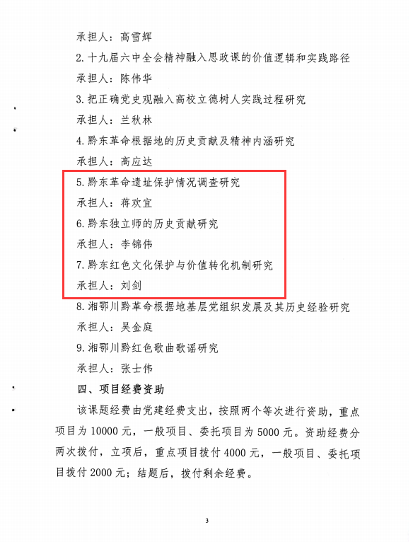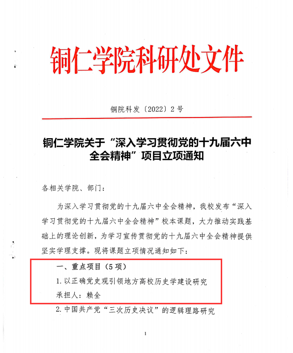 近日,学校科研处下发《美加墨世界杯官方网站关于“深入学习贯彻党的十九届六中全会精神”项目立项通知》(铜院科发[2022]2号)的文件,我院有4项课题获得立项,分别是:赖全承担的《以正确党史观引领地方高校历史学建设研究》获批为重点项目,蒋欢宜承担的《黔东革命遗址保护情况调查研究》、李锦伟承担的《黔东独立师的历史贡献研究》和刘剑承担的《黔东红色文化保护与价值转化机制研究》获批为委托项目。