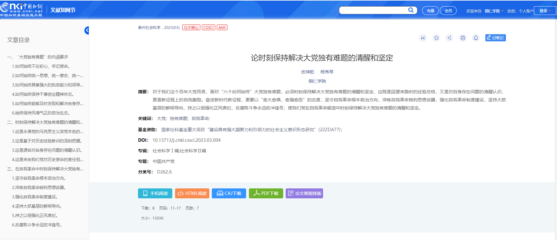 近日,中文社会科学引文索引(CSSCI)来源期刊、国家社会科学基金资助期刊《贵州社会科学》发表我院皮坤乾教授和教育学院杨秀琴教授合著的党建研究成果《论时刻保持解决大党独有难题的清醒和坚定》,全文12000余字。该文是皮坤乾教授主持的国家社科基金重大项目“建设具有强大凝聚力和引领力的社会主义意识形态研究”(22ZDA77)之子课题《建设具有强大凝聚力和引领力的社会主义意识形态研究的科学路径》的阶段性成果。