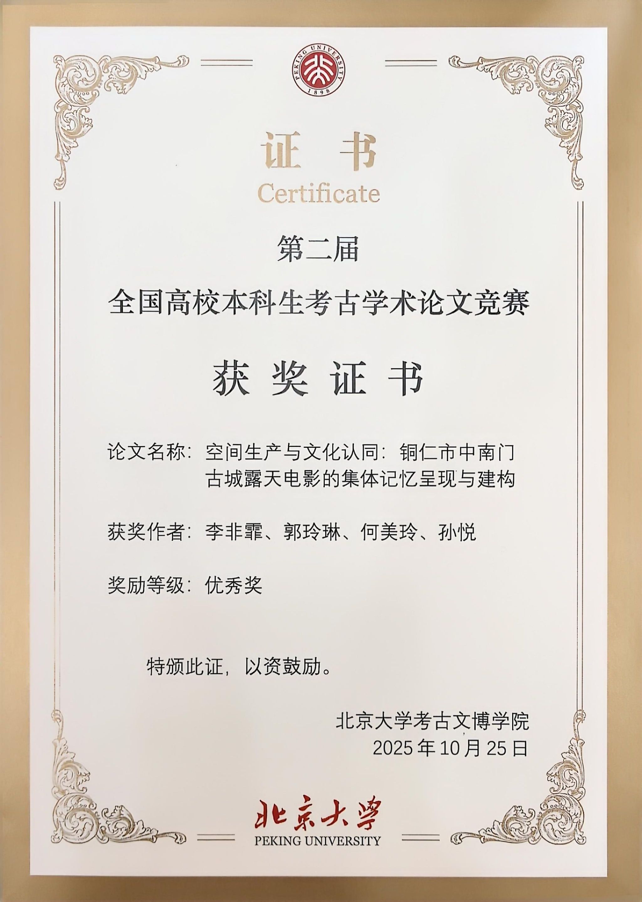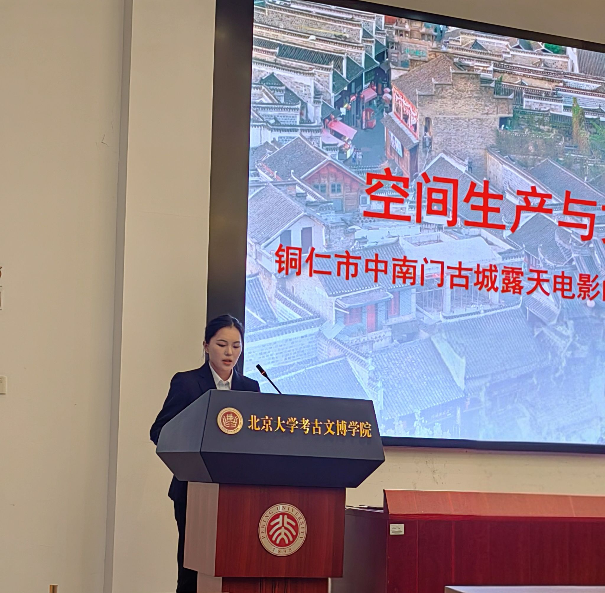 开幕式上,本次论坛联系人、北京大学考古文博学院博士生范宗祥介绍了论坛组织情况,举行了第二届“全国高校本科生考古学术论文竞赛”颁奖仪式。我院李非霏、郭玲琳、何美玲、孙悦四位同学共同提交的论文《空间生产与文化认同:铜仁市中南门古城露天电影的集体记忆呈现与建构》获得优秀奖表彰。在获奖论文交流会上,李非霏同学代表团队做主题交流发言。该论文以铜仁市中南门古城露天电影为研究对象,通过实地参与观影、深度访谈、系统观察、问卷调查等研究方法,结合空间生产与集体记忆理论,探究中南门古城露天电影的公共文化再生产机制。研究表明,露天电影通过“空间生产—记忆建构—认同形塑”的公共文化再生产逻辑,构建了历史文化街区的公共生活场景,成为连接历史记忆与现代生活的文化纽带,对建构集体记忆、增强文化认同、推动铸牢中华民族共同体意识具有重要意义。李非霏同学的汇报得到了与会专家的高度赞扬,充分肯定了论文独特的研究视角和扎实的田野调查基础。