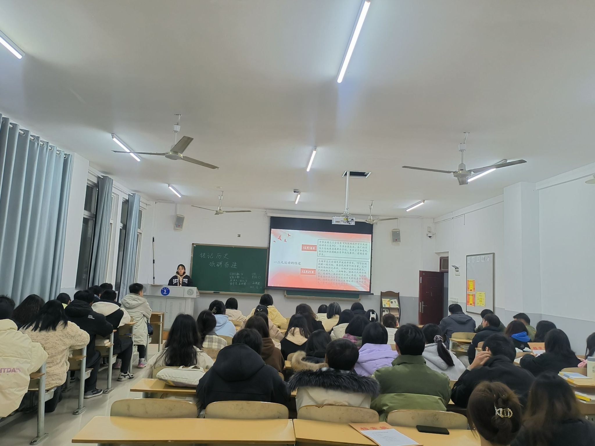 12月11日晚,我院各班于依仁楼A组织召开“铭记历史,砥砺奋进”主题班会活动。通过此次班会活动,让同学们明白了作为新时代的新青年,我们正值风华正茂,意气风发的年纪,我们是民族精神的传承者,我们是祖国明天的建设者,祖国的昨天需要我们铭记,祖国的明天需要我们建设,因此,我们必须要珍惜这大好时光,努力学习,奋发向上。