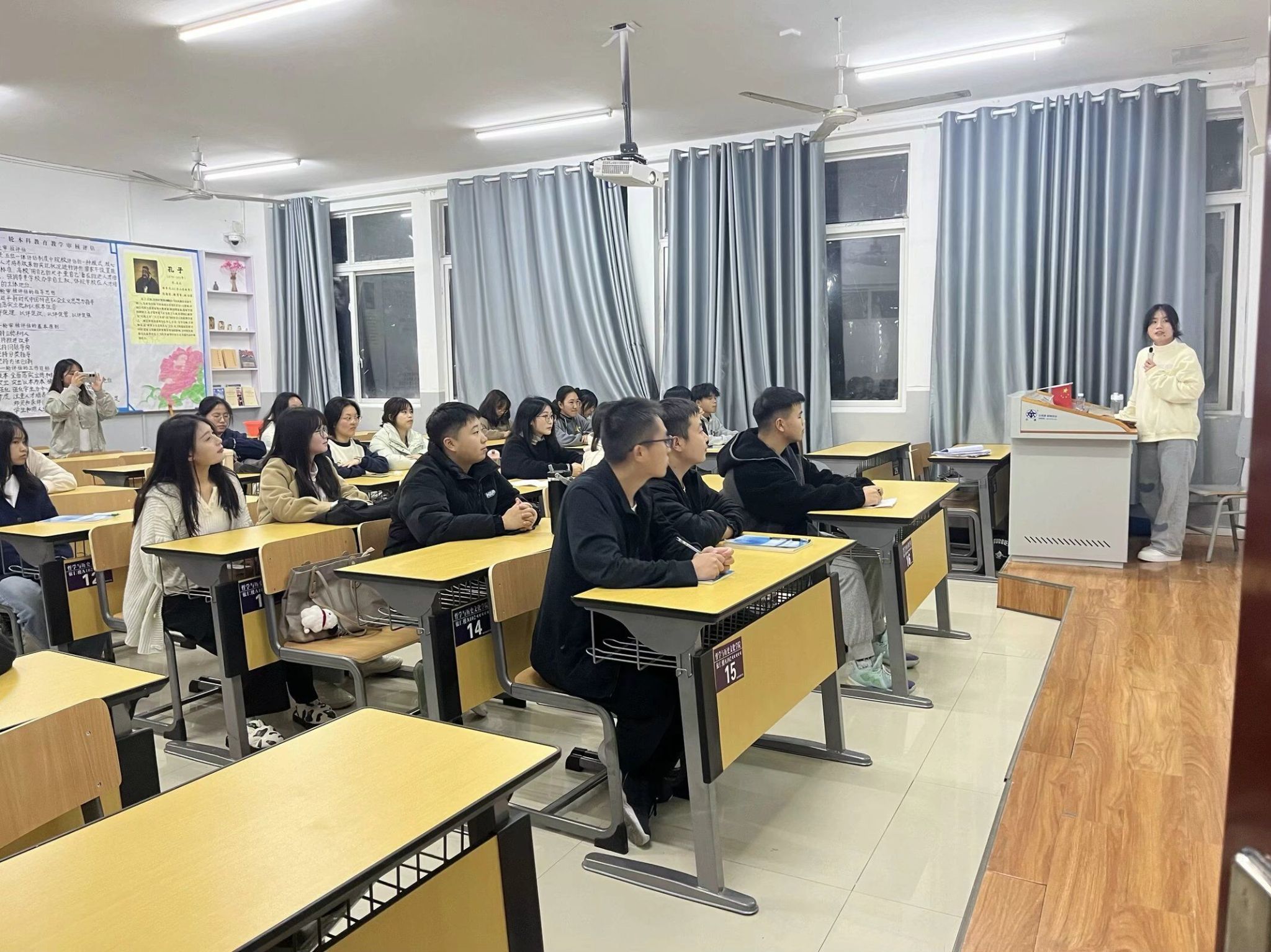 11月27日晚,我院各班于依仁楼A组织召开了“法治信仰教育——与‘宪’同行”主题班会活动。我院各班围绕主题班会展开了学习。如2023级宣讲员利用多媒体向同学们讲解了宪法的概念:又称宪章、根本法,是主权国家或地区具有最高法律效力的根本大法,通常规定一个国家或地区的社会制度、国家制度、国家机构和公民的基本权利与义务等。也通过视频的方式向同学们展示了我们身边的法律,如劳动法、未成年人保护法等。2022级宣讲人采用提问的方式给同学们普及宪法知识,了解到常见的违法行为有违反治安管理处罚条例的扰乱公共秩序、违反环境法的超标排放污染物等,让同学们知法懂法,做法治信仰者、法治捍卫者。通过本次班会的开展,让同学们学习到了宪法的基本知识及如何做宪法坚定捍卫者:大学生要树立法制观念、尊重法律权威、学习法律知识、养成守法习惯、提高用法能力、不断提升自己的法治素养。