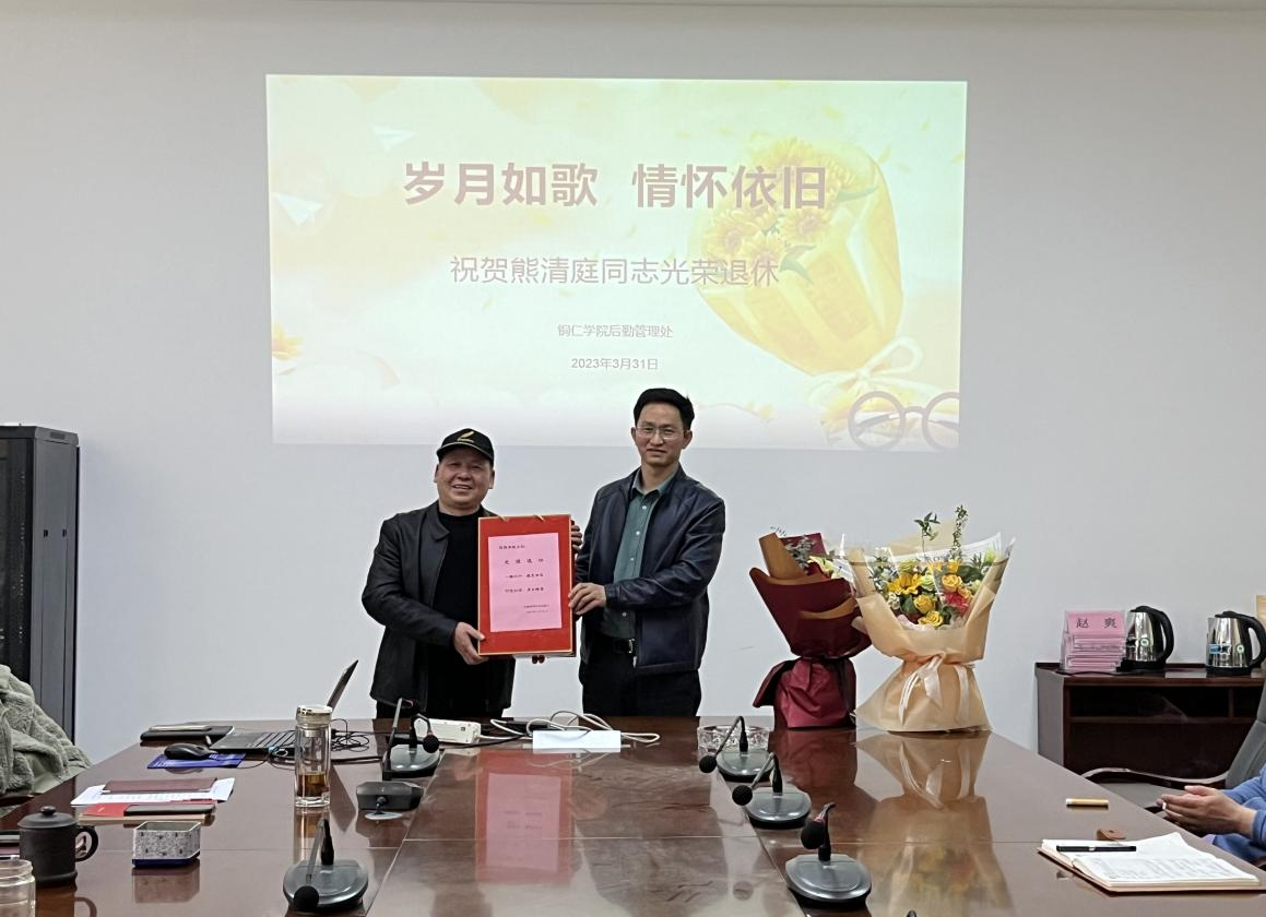 会上,鲁道旺代表部门对退休职工熊清庭同志为学校水电事业所做的贡献给予充分肯定和衷心感谢,并送上退休纪念品,对他40多年来立足本职、爱岗敬业的工作热情和任劳任怨、勤勤恳恳的工作态度给予了高度评价,希望他离岗不离心、退休不褪色,在安享退休幸福生活的同时,继续发挥余热,为学校发展建言献策。