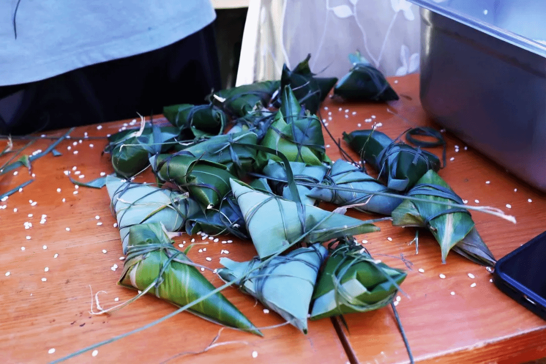 在包粽子比赛现场,有32支队伍积极参赛,限时15分钟,现场展示制作粽子。参赛人员围在一起,在紧张而欢乐的氛围中,双手上下翻飞,捋粽叶、做漏斗、填糯米、压紧实、封口、扎捆,将节日的祝福包裹进一个一个可爱的粽子中。不一会,三角的、四角的、长条的,各种形状的粽子在大家互相交流中摆上了桌。在此过程中,大家一边分享着关于端午节的典故和常识,一边交流包粽子的手法和技巧,现场气氛融融,弥漫着粽叶与糯米的浓浓香味。