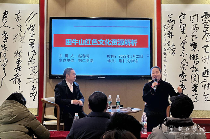 讲座上,赵春莉从学习军史的角度,以详实的资料讲解了当年红六军团在石阡县甘溪遭遇战、困牛山百余红军集体跳崖的情况。1934年,红六军团西征进军石阡途中,甘溪战役失利,陷入湘桂黔三省敌军重围。为掩护军团主力转移,红六军团第十八师第五十二团把敌军引向了困牛山,拖进了这个“牛儿也会时常迷路”的险境里,红六军团主力安全突围。然而面对多于自己十倍的敌人,负责断后的十八师红军战士浴血奋战,只剩下400多人,师长龙云带领200多名红军突围。面对敌人的步步逼近,战斗到最后的100余名红军战士宁死不误伤群众、宁死不做俘虏,边打边退,直到退到悬崖边,毅然飞身集体跳崖。赵春莉对困牛山红色文化资源解析,声情并茂,激动人心。最后,赵幼立对困牛山红军壮举以及参与困牛山战斗的调查等情况进行了补充介绍。