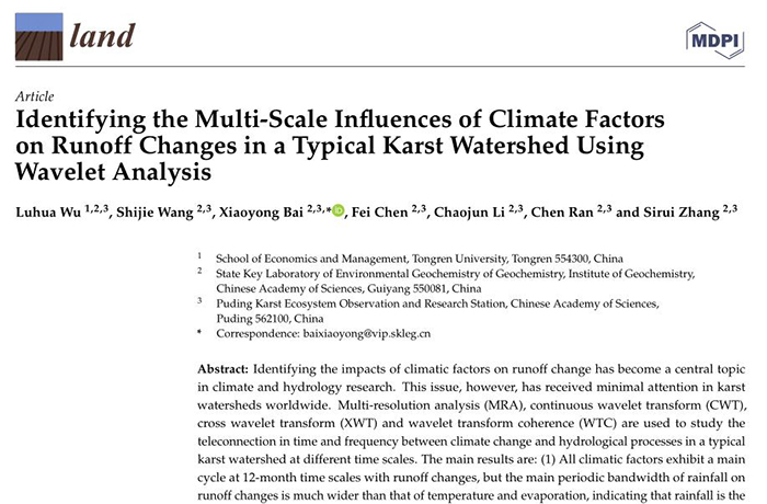 2022年8月,世界杯官网经济管理学院吴路华博士以第一作者在国际SCI期刊(中国科学院3区)《Land》上,在线发表题为《Identifying the multi-scale influences of climate factors on runoff changes in a typical karst watershed using wavelet analysis》的学术论文(Volume 11, August 2022, 1284;IF=3.905),耦合应用多种小波分析方法识别了气候因素对典型喀斯特流域径流量变化的多时间尺度影响。
