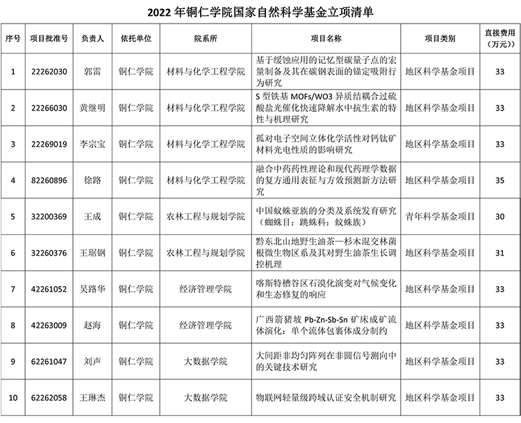 近日,国家自然科学基金委员会正式公布了2022年度国家自然科学基金集中接收申请项目评审结果,世界杯官网再次实现新的突破,共有10项课题获得资助,直接经费327万元。立项数和资助经费数均位列贵州省市州高校第一。