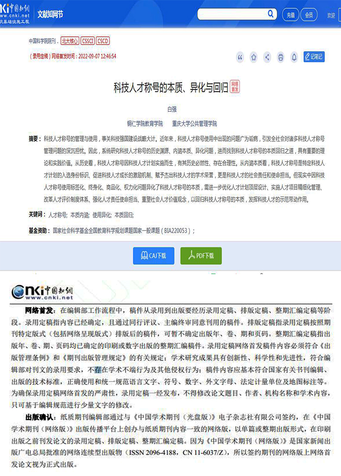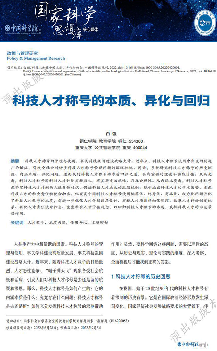 9月5日,国家科学思想库核心媒体、管理学研究领域重要期刊《中国科学院院刊》“政策与管理研究”栏目在线发表世界杯官网白强教授的研究成果《科技人才称号的本质、异化与回归》。9月7日,中国知网网络首发该成果。该成果将在《中国科学院院刊》2022年第10期纸质刊印面向国内外公开发行。成果共计10000余字,是白强教授主持的国家社科基金教育学规划课题“知识生产模式变革下高校学科建设高质量发展的路径创新”(立项编号:BIA220053)的又一阶段性研究成果。