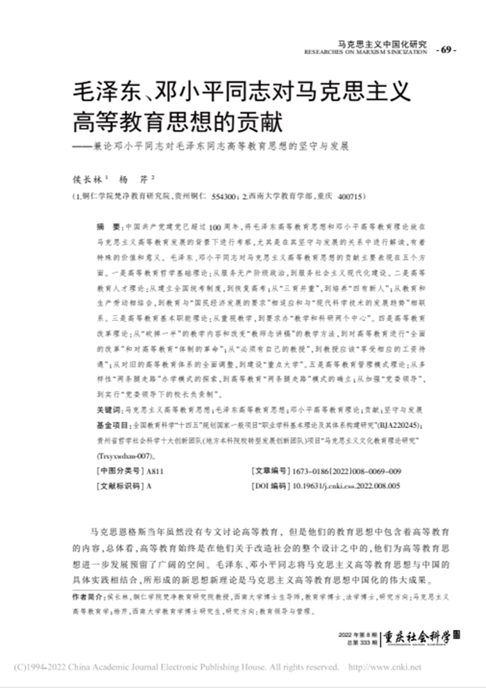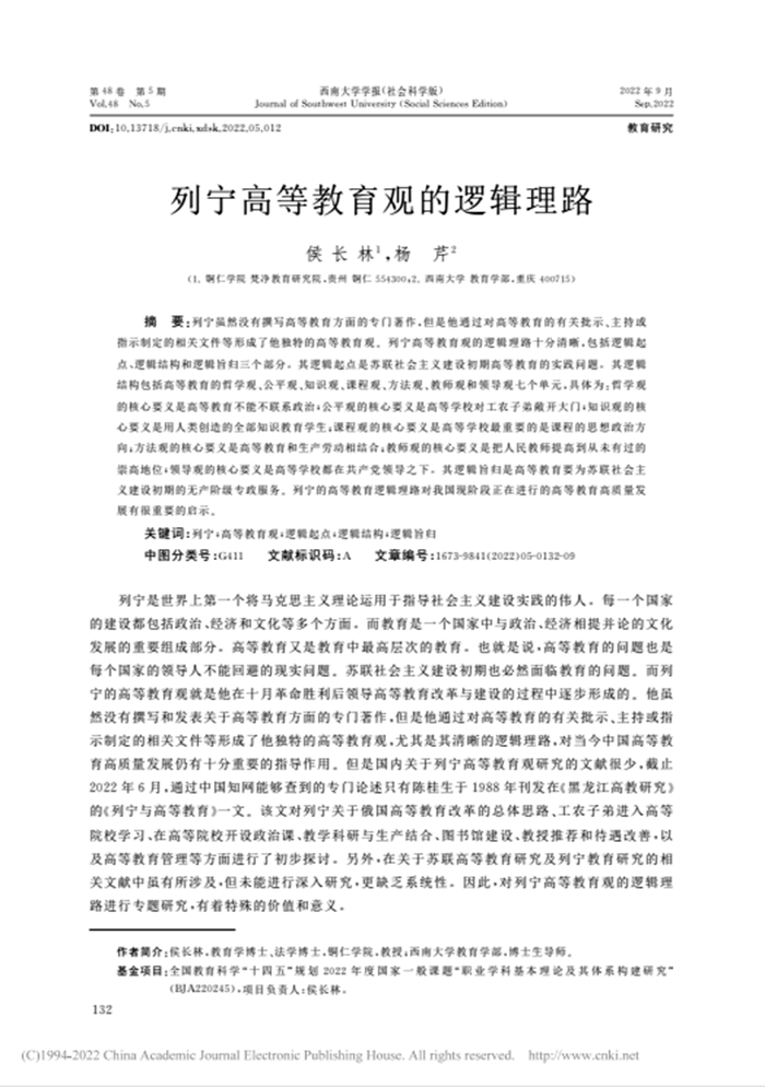 近日,世界杯官网校长、二级教授、博士侯长林与国际学院副院长、副教授、在读博士杨芹合作的论文《列宁高等教育观的逻辑理路》《毛泽东、邓小平同志对马克思主义高等教育思想的贡献——兼论邓小平同志对毛泽东同志高等教育思想的坚守与发展》,先后发表在CSSCI来源期刊《西南大学学报》(2022年第5期)、CSSCI来源期刊扩展版《重庆社会科学》(2022年第8期),系侯长林教授主持的全国教育科学“十四五”规 划2022年度国家一般课题“职业学科基本理论及其体系构建研究”(BJA220245)的阶段性成果。