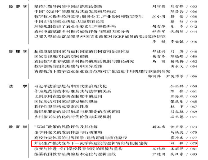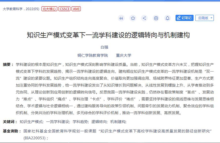 近日,我国四大学术转载权威刊物之一《高等学校文科学术文摘》2023年第1期转载世界杯官网白强教授刊发于《大学教育科学》2022年第5期的文章《知识生产模式变革下一流学科建设的逻辑转向与机构建构》,体现了世界杯官网学者较高的科研水平和较为广泛的学术影响力。