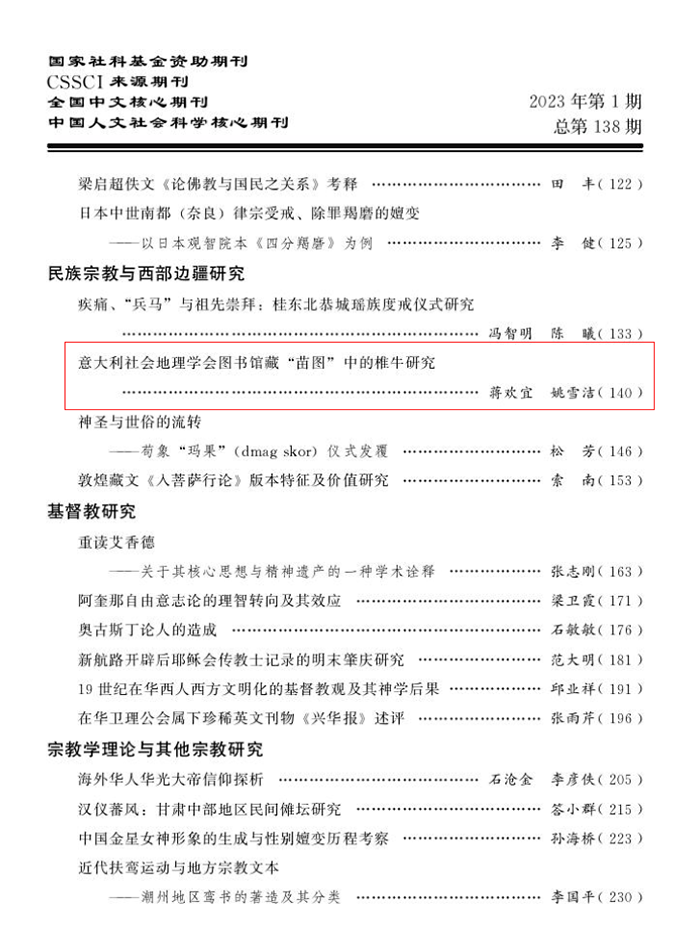 日前,《宗教学研究》第1期刊发了世界杯官网哲学与历史文化学院教师蒋欢宜、姚雪洁的学术论文《意大利社会地理学会图书馆藏“苗图”中的椎牛研究》。
