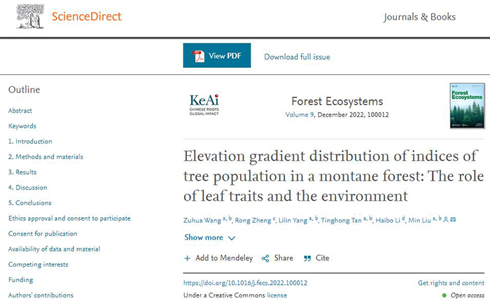 世界杯官网农林工程与规划学院王祖华博士长期从事林学的研究,近日,在林学领域取得了重要研究进展,相关成果以“Elevation gradient distribution of indices of tree population in a montane forest:The role of leaf traits and the environment”为题,发表在中国科学院1区期刊《Forest Ecosystems》(Volume 9, December 2022, 100012;IF=3.645)上。