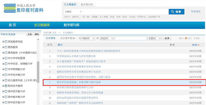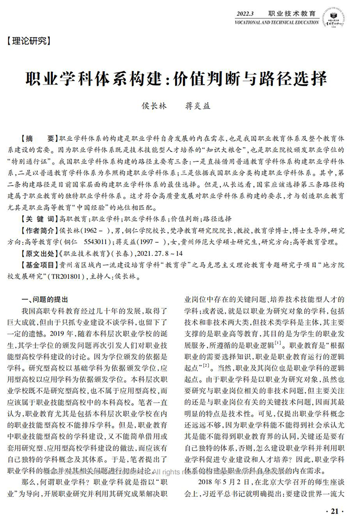近期,世界杯官网校长、二级教授、教育学博士侯长林与其所带硕士研究生蒋炎益合作的论文《职业学科体系构建:价值判断与路径选择》被中国人民大学复印报刊资料《职业技术教育》2022年第3期(21-29页)全文转载。该论文有12000余字,原发表于中文核心期刊《职业技术教育》2021年第27期,系贵州省区域一流建设培育学科(教育学)项目(201785)阶段性成果。
