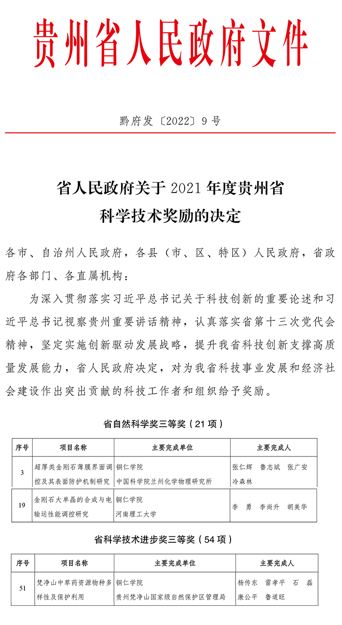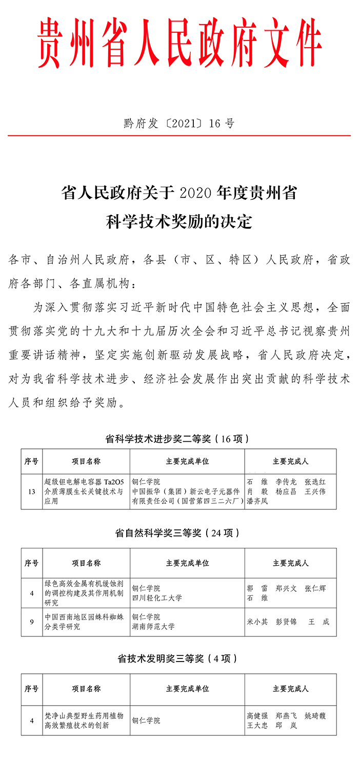 近日,全省科技创新暨科技奖励大会在贵阳举行,世界杯官网共有7项成果获得2020年度、2021年度贵州省科学技术奖。其中,省科学技术进步奖二等奖1项、省科学技术进步奖三等奖1项,省自然科学奖三等奖4项、省技术发明奖三等奖1项。获奖数量位列地方高校第一。