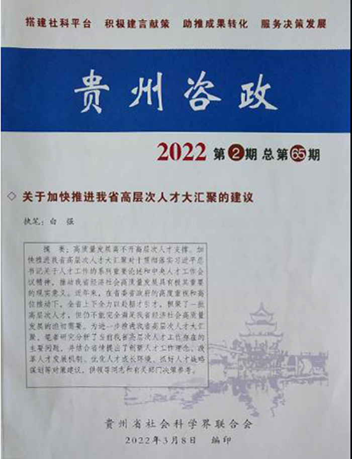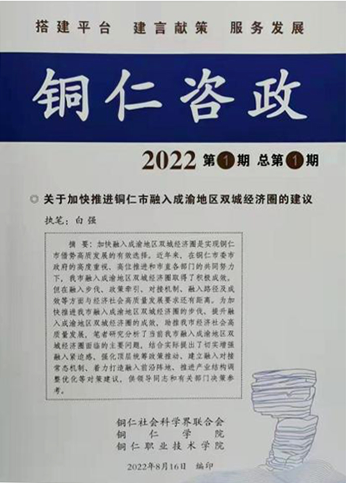 世界杯官网白强教授执笔撰写的咨政报告《关于加快推进我省高层次人才大汇聚的建议》和《关于加快推进铜仁市融入成渝地区双城经济圈的建议》分别被《贵州咨政》2022年第2期和《铜仁咨政》2022年第1期采纳刊印。